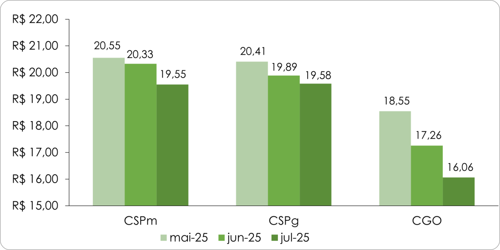 O sistema CGO (Confinamento Goiás) voltou a registrar o menor custo da diária-boi, com uma queda de 7,0% entre junho e julho. CSPg e CSPm, em São Paulo, também apresentaram redução, ainda que mais moderada.