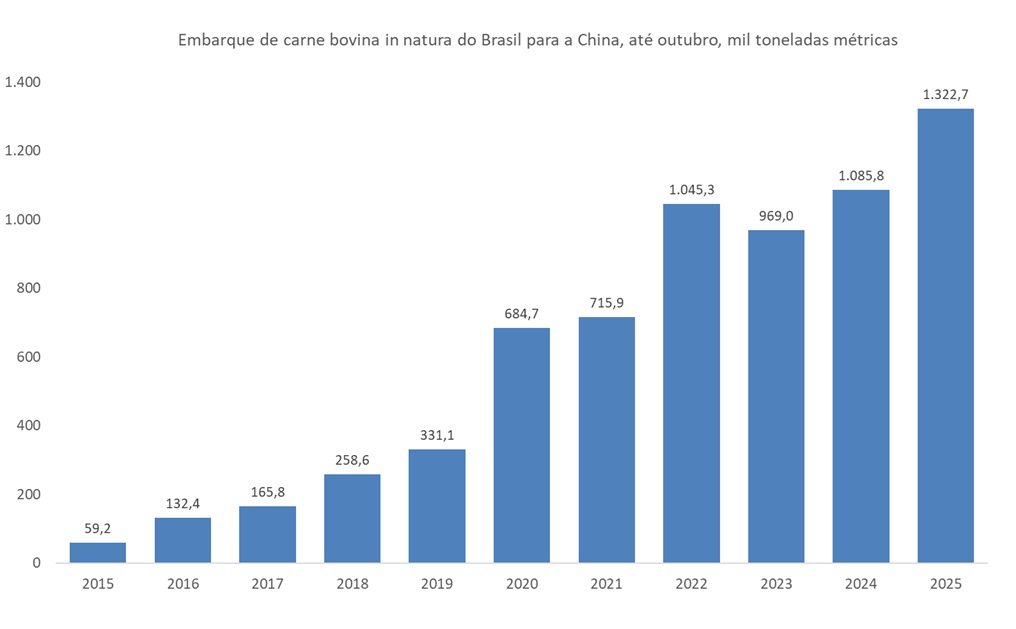 A importação de carne bovina do Brasil pelos chineses foi recorde em 2025, até outubro, com alta de 21,8% frente a 2024.