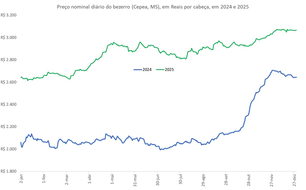 A Figura ilustra a evolução diária do preço nominal do bezerro (Cepea, Mato Grosso do Sul), avaliado em Reais por cabeça em 2024 e 2025.