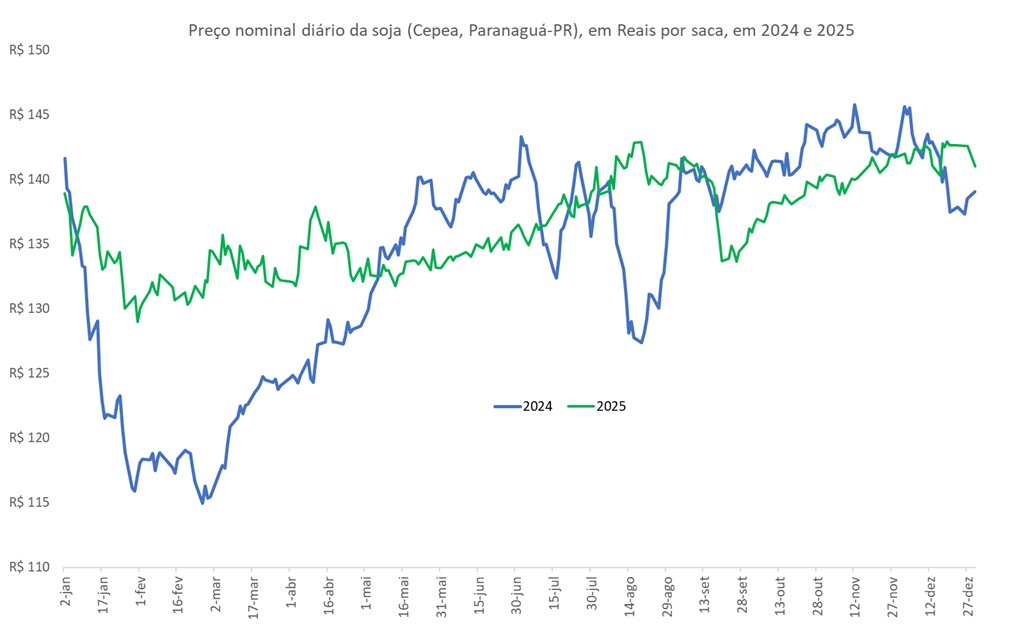 A Figura ilustra a evolução diária do preço nominal da soja (Cepea, Paranaguá-PR), avaliado em Reais por saca em 2024 e 2025.