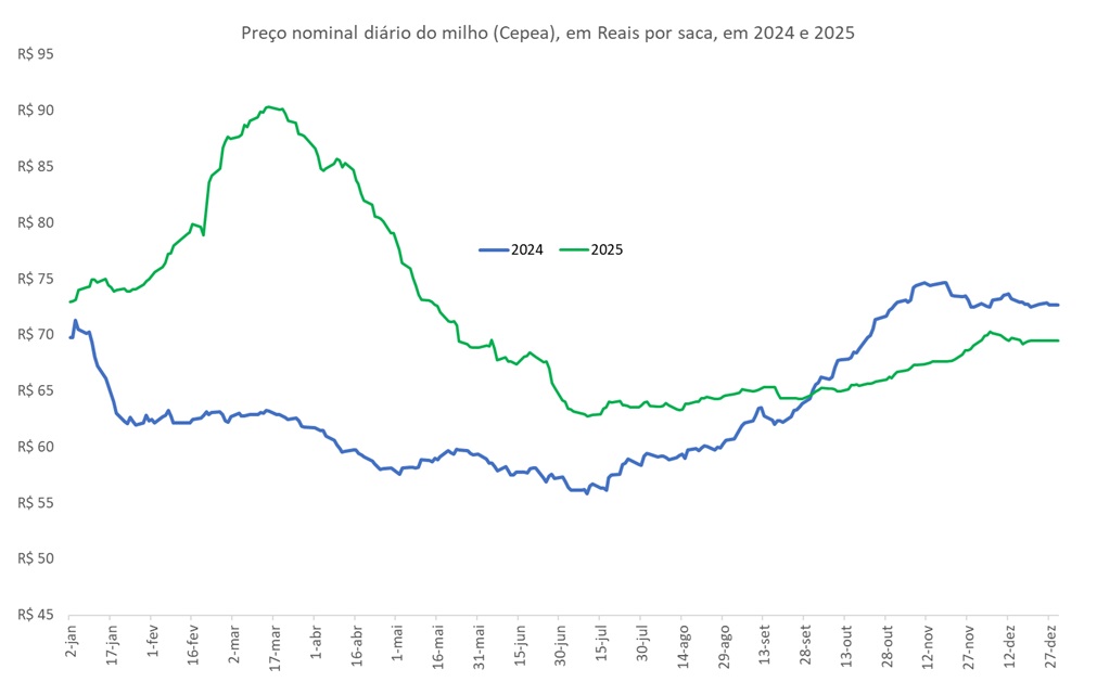 A Figura ilustra a evolução diária do preço nominal do milho (Cepea), avaliado em Reais por saca em 2024 e 2025.