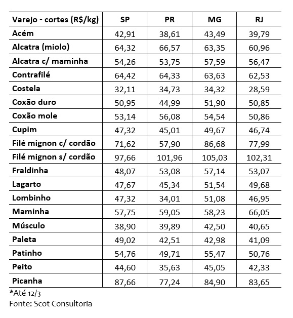Tabela 1. Preços médios dos cortes no mercado varejista na semana*, em R$/kg.
