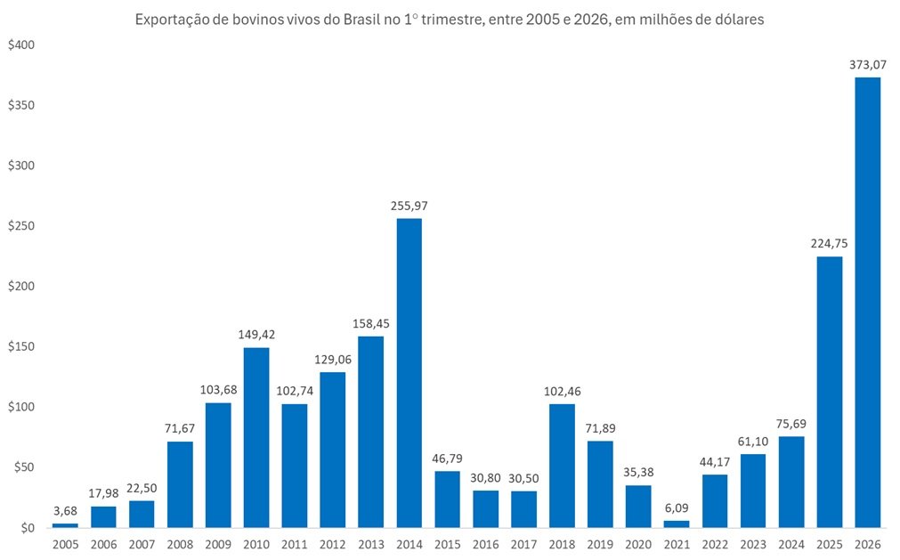 Nos primeiros 3 meses de 2026 a venda de bovinos vivos do Brasil somou o equivalente a US$373,07 milhões, valor 66,0% do praticado em 2025, quando no 1° trimestre somou US$224,75 milhões. O valor do 1° trimestre de 2026 foi também 45,7% acima do recorde anterior para o período do ano, de 2014 (255,97 milhões).