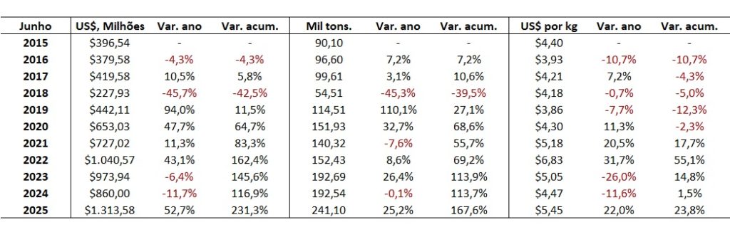 A receita também foi recorde par um mês de junho, superando pela segunda vez o patamar de U$1,0 bilhão no período do ano, a exemplo de 2022 (Tabela). O preço em alta da carne bovina brasileira no mercado internacional também contribuiu para a alta na receita que foi, em junho de 2025, 22,0% maior que a observada em junho de 2024.