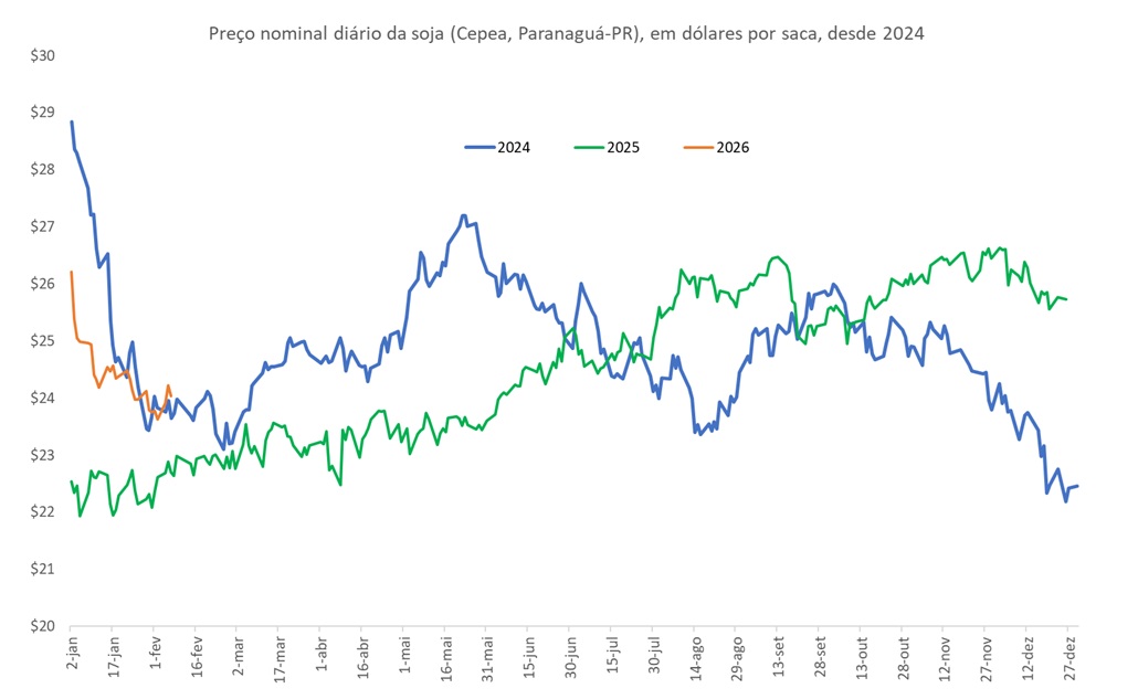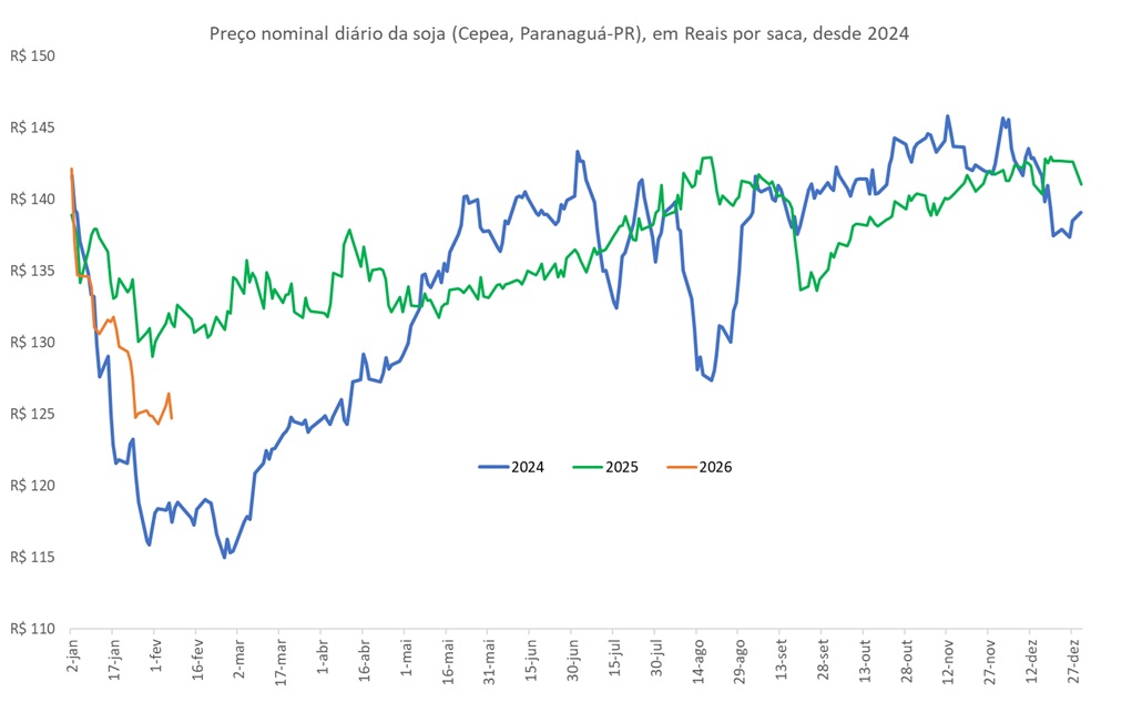 Apesar do recorde de vendas em 2025 e da alta em janeiro de 2026 frente ao mesmo período do ano anterior, o preço da soja (Cepea, Paranaguá-PR) segue oscilando próximo da mínima de 2026, cotado a R$124,3 por saca (primeira Figura). O preço em fevereiro (9) acumula perda de 11,5% frente ao valor que encerrou 2025.