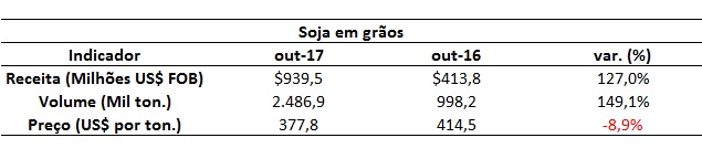 O faturamento aumentou 127,0% neste período, menor que o crescimento dos embarques em virtude da queda (8,9%) no preço médio do grão nesta base anual de comparação. Em outubro de 2017 o Brasil faturou US$939,5 milhões com a venda de soja no mercado internacional, enquanto em outubro de 2016 a receita foi de US$413,8 milhões.