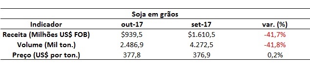 A Tabela abaixo destaca os dados de exportação de soja do Brasil em outubro de 2017 e os compara com os números do mês anterior (setembro de 2017).