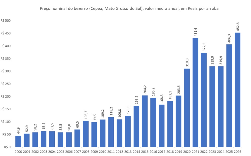 A Figura apresenta os dados médios anuais do preço nominal do bezerro (Cepea, Mato Grosso do Sul), em Reais por arroba, entre 2000 e a parcial de 2026 (até fevereiro, 25).