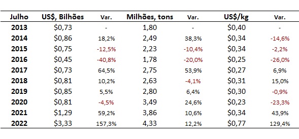 O fato é que as importações seguem renovando as máximas históricas em 2022, tanto em ritmo de compra como em preço médio (Tabela) e em julho de 2022 o cenário não foi diferente e os valores ficaram muito acima do observado no mesmo período dos anos anteriores.