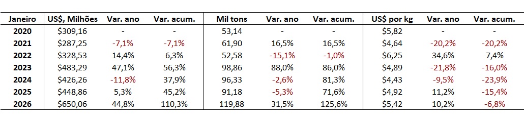 O embarque de janeiro de 2026 somou 119,88 mil toneladas métricas, valor 31,5% acima do observado no mesmo período de 2025 e acima do recorde anterior para o período do ano, de 2023 (98,86 mil toneladas).