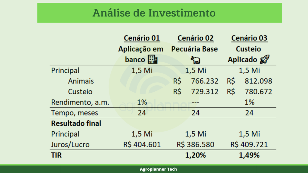 Figura 1. Análise de investimento comparativa entre mercado financeiro e dois cenários de produção de bovinos em recria e engorda.