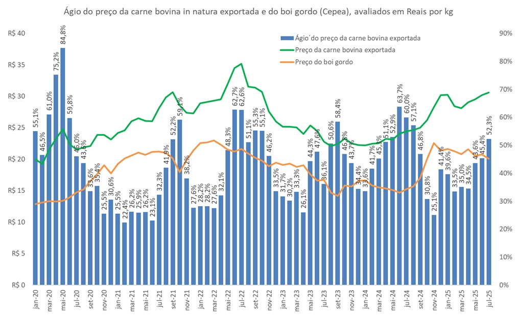 A margem de exportação, representada pelo ágio do preço da carne bovina exportada em relação ao boi gordo alcançou, na parcial de julho, o maior patamar de 2025.