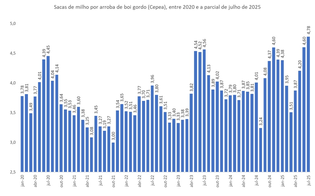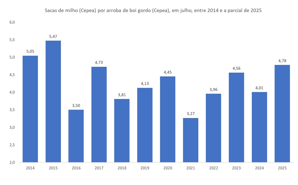 O indicador que mede a capacidade de troca de milho por arroba de boi gordo alcançou o maior patamar para um mês de julho em mais de 10 anos.