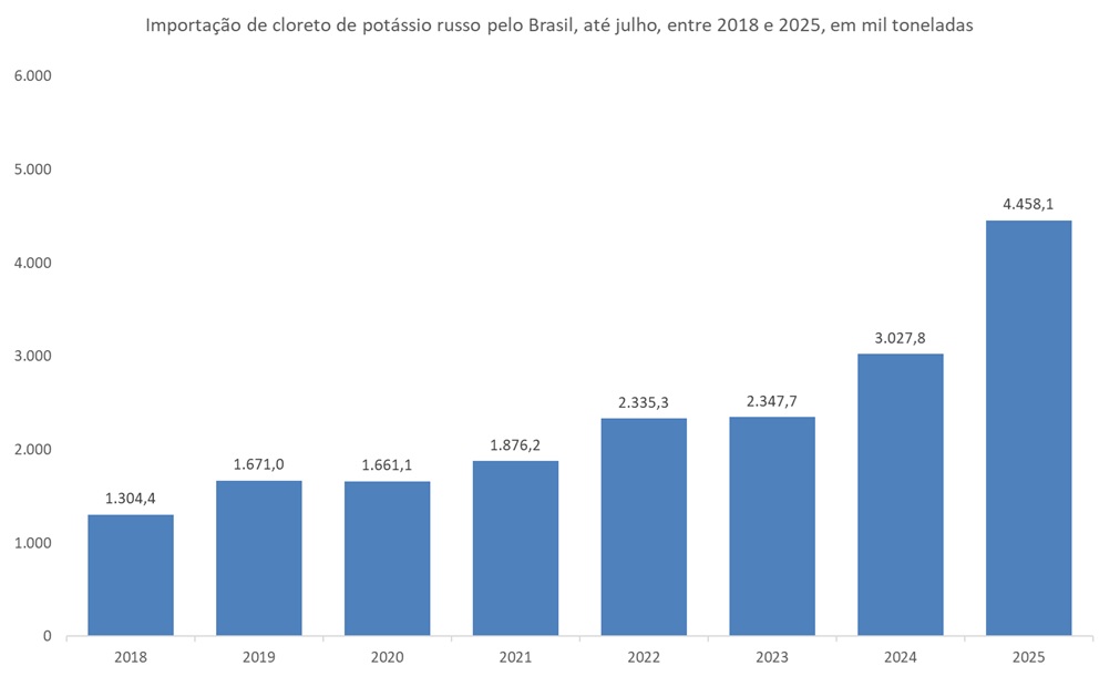 A Figura apresenta dados da importação de cloreto de potássio russo pelo Brasil, entre janeiro e julho, em mil toneladas, entre 2018 e 2025, segundo dados da COMEX.