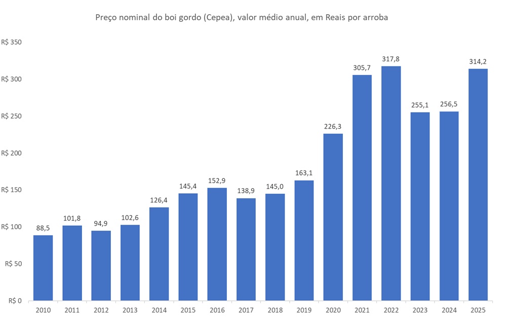 Em 2025, o preço médio nominal do boi gordo foi 22,5% acima do valor observado em 2024, também em valor nominal. O preço médio do boi gordo em 2025 de R$314,2 por arroba (média até o dia 29 de dezembro) ficou muito próximo da máxima nominal de 2022 (R$317,8), como mostram os dados da segunda Figura.