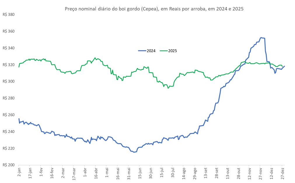 O preço do boi gordo ficou relativamente estável ao longo de 2025, frente ao valor que encerrou 2024, mas se manteve, em praticamente todo ano, acima do valor praticado no mesmo período do ano anterior. As únicas exceções foram novembro e dezembro (primeira Figura). O preço médio de dezembro de 2025 (Cepea), até o dia 29, de R$320,3 por arroba ficou pouco abaixo da média nominal de dezembro de 2024 (R$322,1) apesar do valor diário superar o mesmo período do ano anterior ao longo da segunda metade do mês.