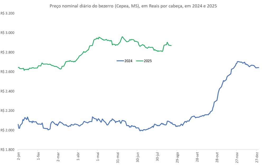 A Figura ilustra a evolução diária do preço nominal do bezerro (Cepea, Mato Grosso do Sul), em Reais por cabeça, ao longo de 2024 e 2025.