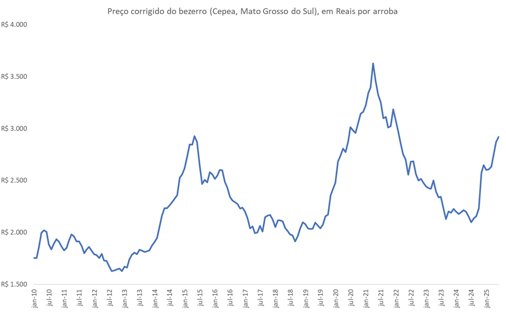 O preço corrigido do bezerro (Cepea, Mato Grosso do Sul) no 1º semestre de 2025 de R$2.732,3 por cabeça foi 24,8% maior que o valor praticado no mesmo período de 2024 e o maior para o período do ano desde 2022.