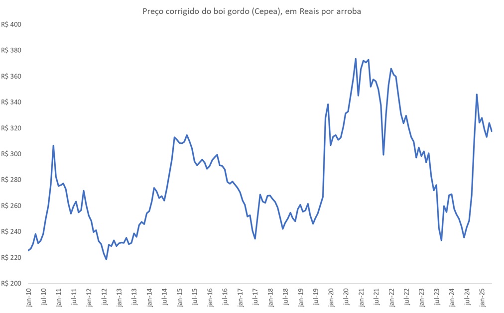 Assim como acontece para o bezerro, o preço médio do boi gordo em 2025 se mantém não muito distante da máxima nominal histórica, quando em março de 2022 o valor da arroba superou o patamar de R$340,0 por arroba (Cepea), como mostram os dados apresentados na terceira Figura abaixo.