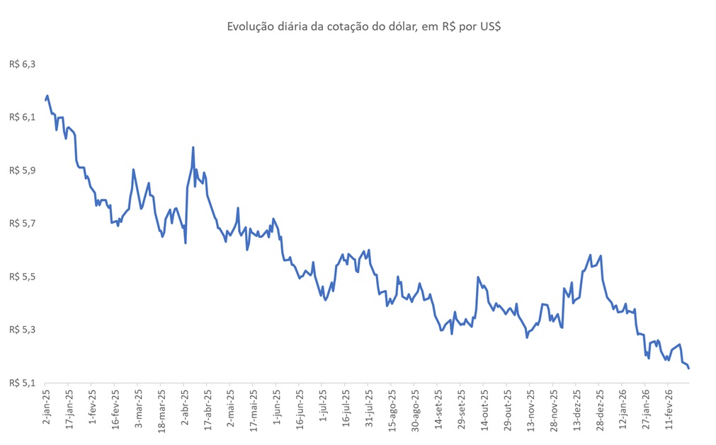 O dólar em fevereiro (24) renovou a mínima de 2026 (segunda Figura), cotado a R$5,16, valor muito abaixo do observado em fevereiro de 2025, quando a média mensal ficou em R$5,77.