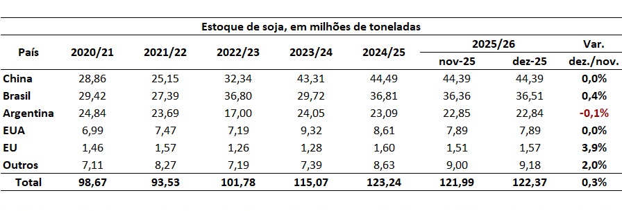 A Tabela apresenta os dados de estoque final de soja no mundo e por país, em milhões de toneladas, segundo dados do USDA, revisados em dezembro de 2025.