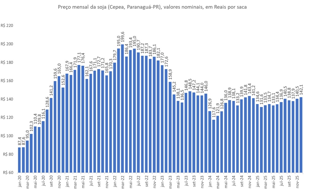 A Figura apresenta os dados do preço médio nominal da soja (Cepea, Paranaguá-PR) entre janeiro de 2020 e a parcial de dezembro de 2025 (até o dia 26), em Reais por saca.