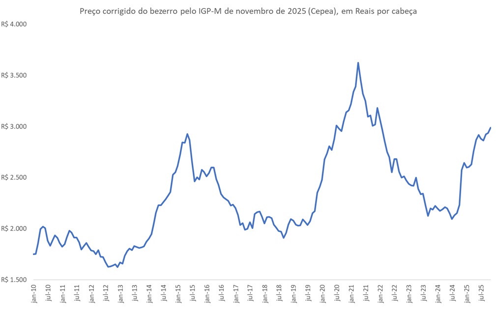 A Figura ilustra a evolução mensal do preço do bezerro (Cepea, Mato Grosso do Sul) corrigido pelo IGP-M de novembro de 2025, avaliado em Reais por cabeça, desde janeiro de 2010.