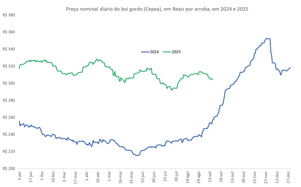 A Figura apresenta a evolução diária do preço nominal do boi gordo (Cepea), avaliado em Reais por arroba, em 2024 e a parcial de 2025.