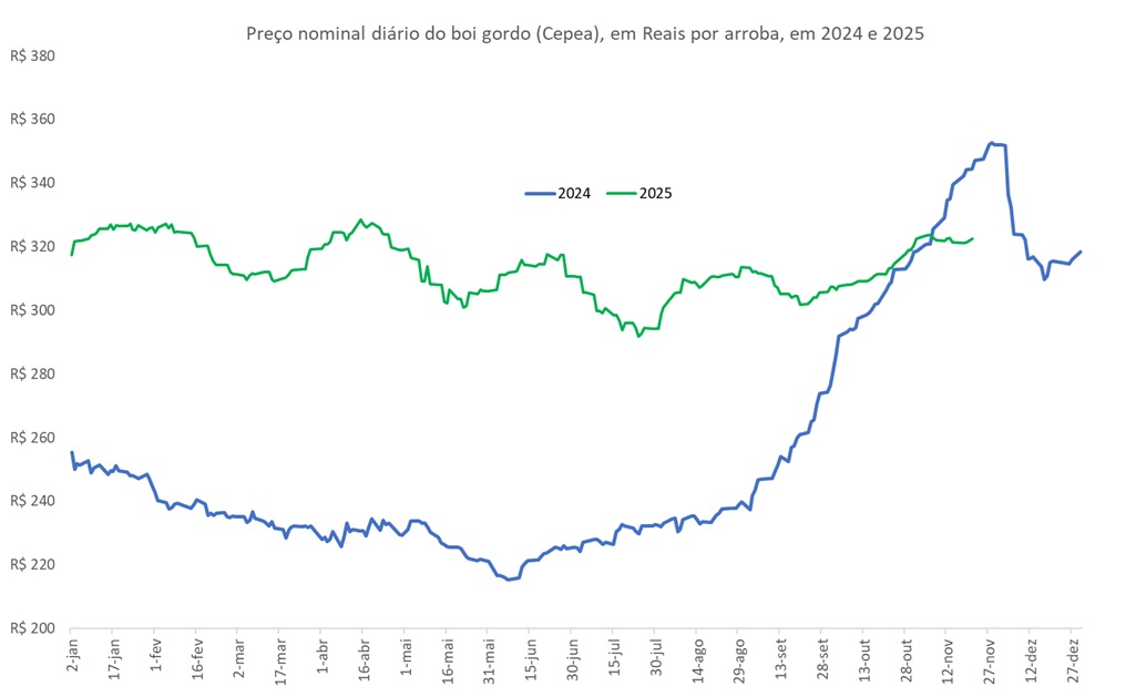 A Figura compara o preço nominal do boi gordo (Cepea), em 2024 e 2025, avaliado em Reais por arroba.