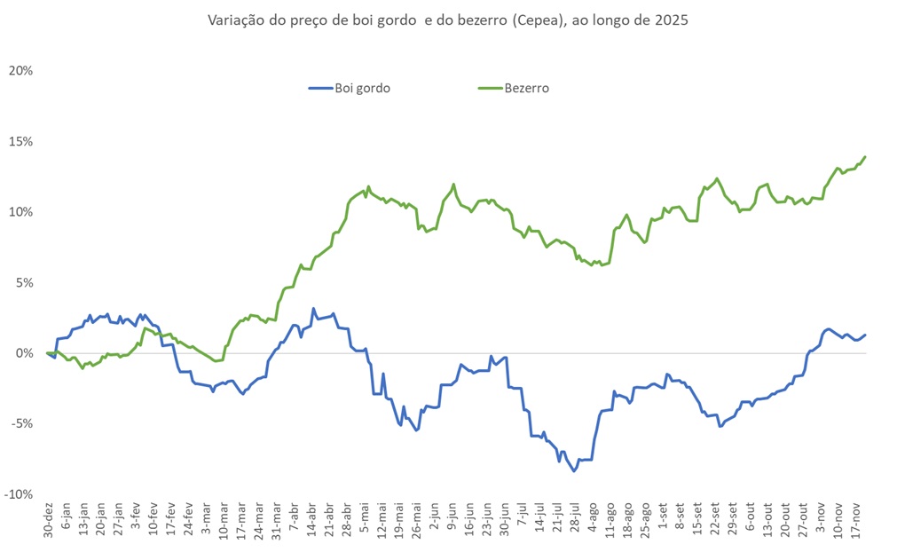 A Figura ilustra a variação diária acumulada do preço do bezerro (Cepea, Mato Grosso do Sul) e do boi gordo (Cepea), ao longo de 2025.