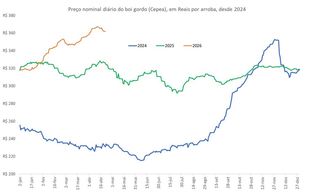 A Figura ilustra a evolução diária do preço nominal do boi gordo (Cepea), em Reais por arroba, desde 2024.