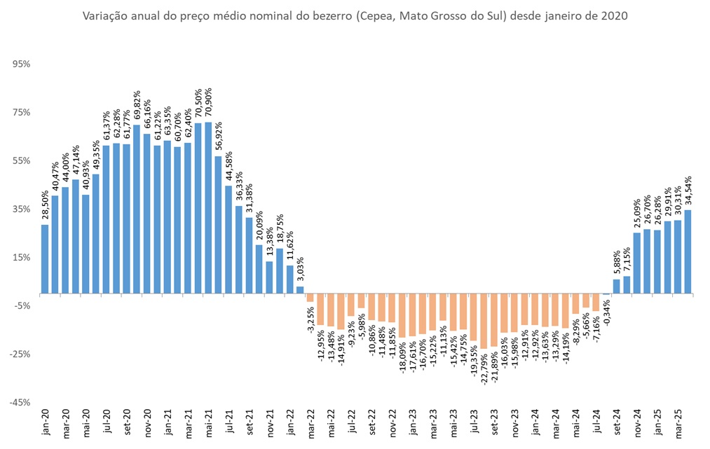 A Figura ilustra a evolução da variação anual do preço médio nominal do bezerro (Cepea, Mato Grosso do Sul), entre janeiro de 2020 e a parcial de abril de 2025 (média até o dia 25).