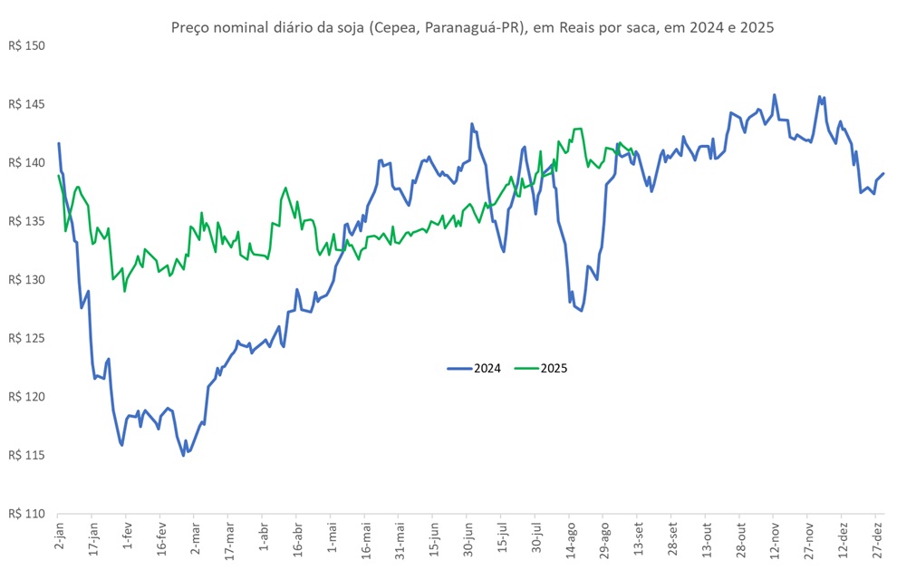 A Figura ilustra a evolução diária do preço nominal da soja (Cepea, Paranaguá-PR), avaliada em Reais por saca, em 2024 e a parcial de 2025.