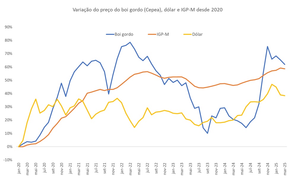 Afinal, como se comportou, ao longo dos últimos 12 meses, ou seja, entre março de 2024 e março de 2025 e também desde 2020, o preço do boi gordo comparado ao indicador de inflação, medido pelo IGP-M e o dólar?