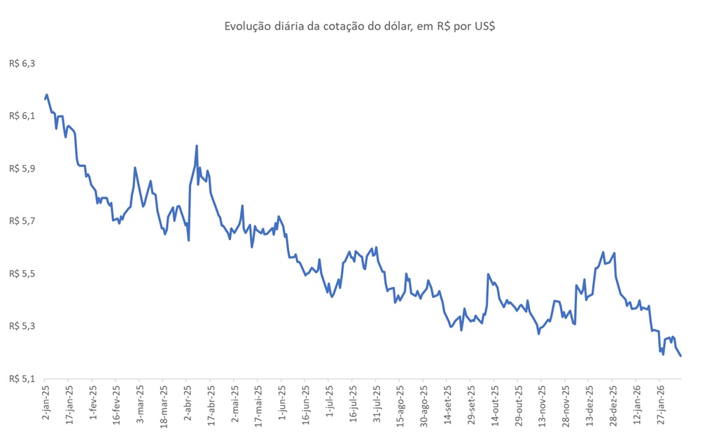 A Figura apresenta a evolução diária da cotação do dólar (Reais por dólar), em valor nominal, desde o início de 2025.