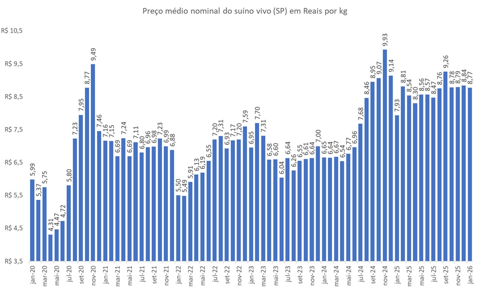 O valor médio parcial do suíno vivo (Cepea, SP) em janeiro de 2026 de R$8,77 por kg, apesar da queda frente aos meses anteriores, ficou 10,6% acima da média nominal de janeiro de 2025 (R$7,93).
