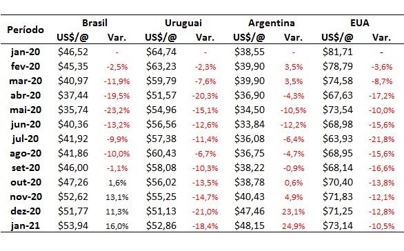 Entre janeiro de 2020 e janeiro de 2021 o preço do boi gordo no País acumulou alta de 16,0%, variando de US$46,52 por arroba a US$53,94 por arroba, segundo dados do Cepea, convertidos em moeda americana (dólar comercial para venda). No mesmo período, o preço do boi gordo no Uruguai, em dólares por arroba, acumulou queda de 18,4% e, apesar da alta acumulada no preço do boi gordo argentino, de 24,9% entre janeiro de 2020 e 2021 o valor segue abaixo do preço praticado no Brasil (Tabela).