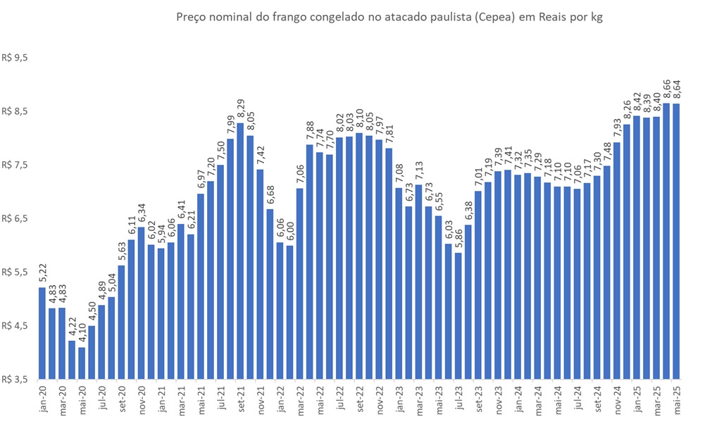 A Figura apresenta os dados do preço médio nominal do frango congelado no atacado paulista (Cepea), em Reais por kg, entre janeiro de 2020 e a parcial de maio de 2025 (média até o dia 28).