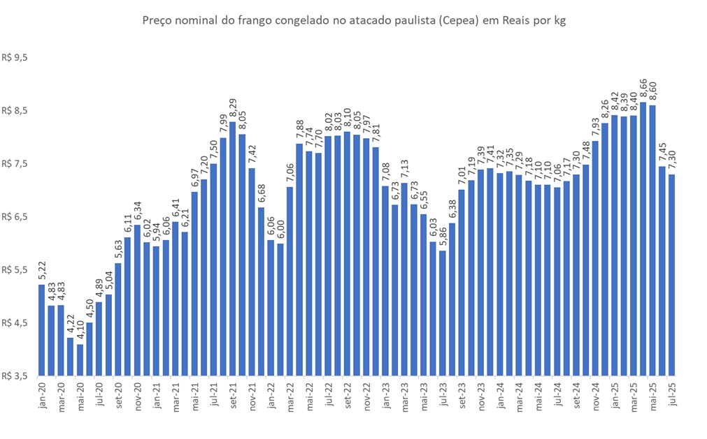 A Figura apresenta os dados do preço médio nominal do frango no atacado paulista (Cepea), em Reais por kg, entre janeiro de 2020 e julho de 2025.