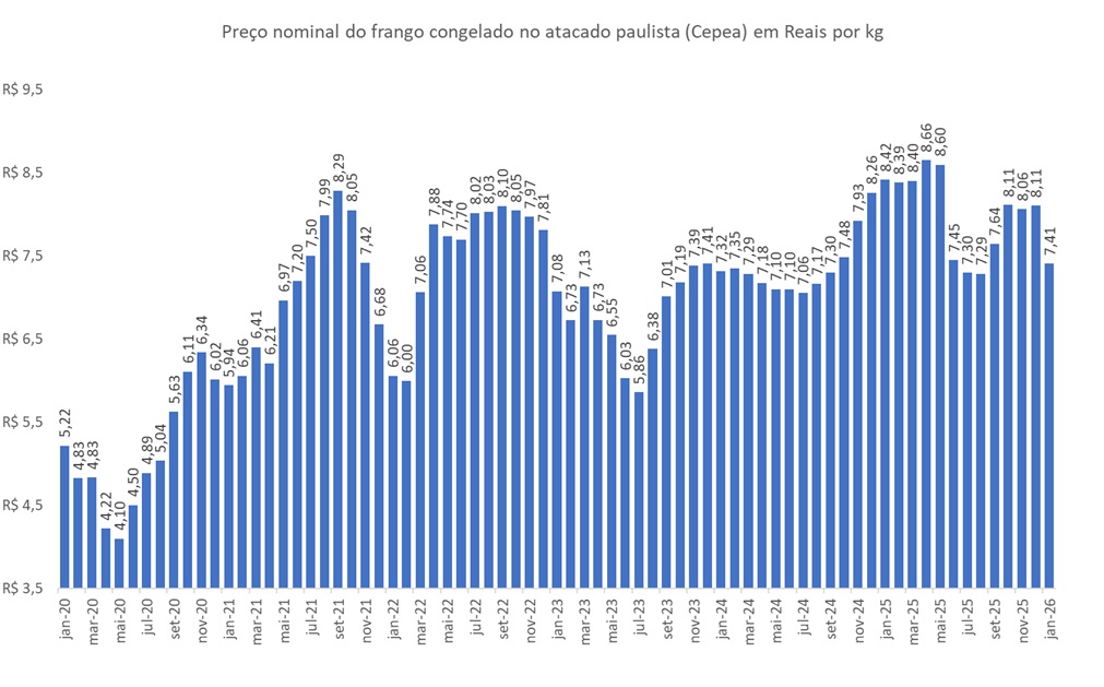 O preço do frango congelado no atacado paulista (Cepea), além da queda frente aos meses anteriores, ficou muito abaixo do valor nominal praticado em janeiro de 2025.