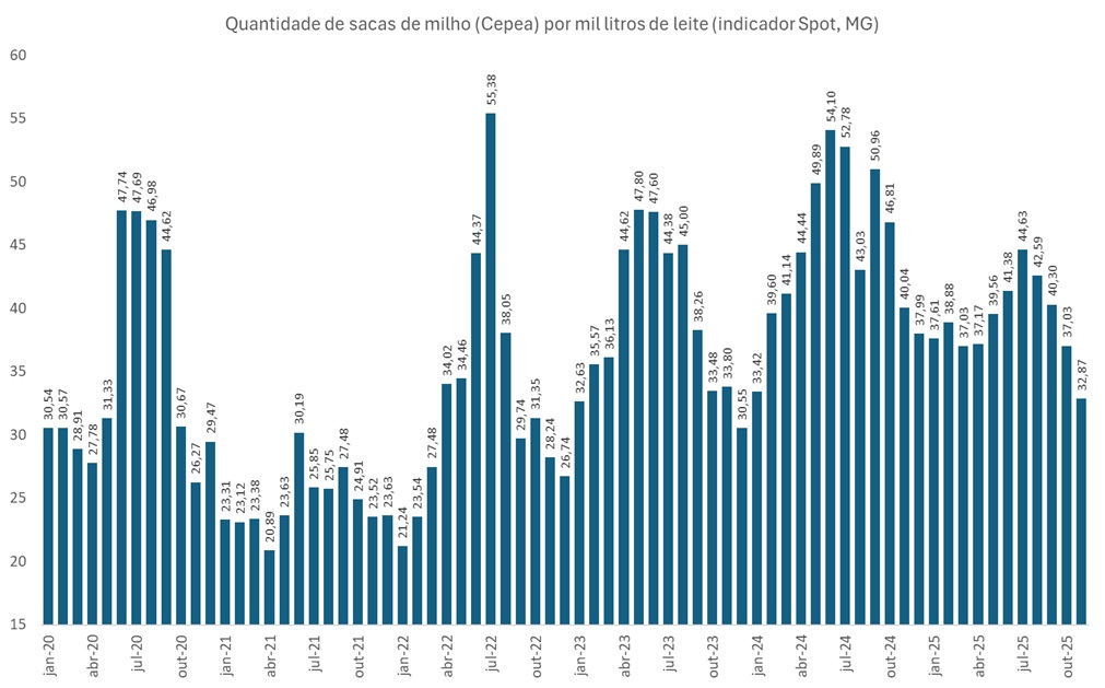 Em novembro de 2025 com o valor equivalente de 1.000 litros do indicador Spot de leite (MG, R$2,22 mil) foi possível adquirir, em média, 32,67 sacas de milho (Cepea), enquanto em novembro de 2024 o valor foi de 40,04.