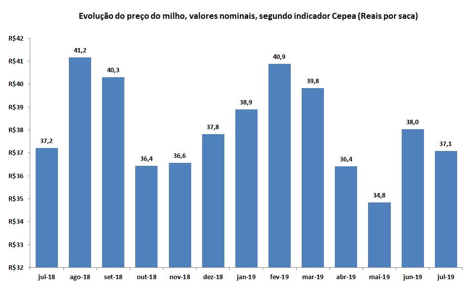 Apesar da queda na base mensal de comparação, o preço do milho em julho de 2019 foi próximo do valor praticado no mesmo período de 2018, em valor nominal (R$37,2 por saca).
