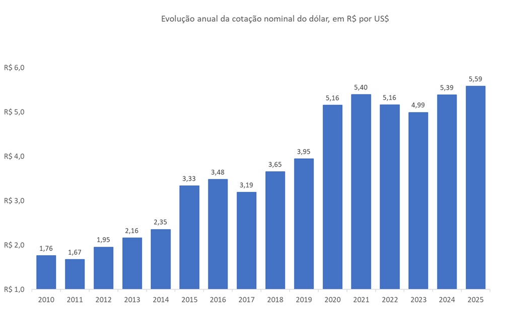 A Figura abaixo ilustra a evolução média anual da cotação da moeda americana (comercial), em Reais por dólar, valor nominal, entre 2010 e 2025.