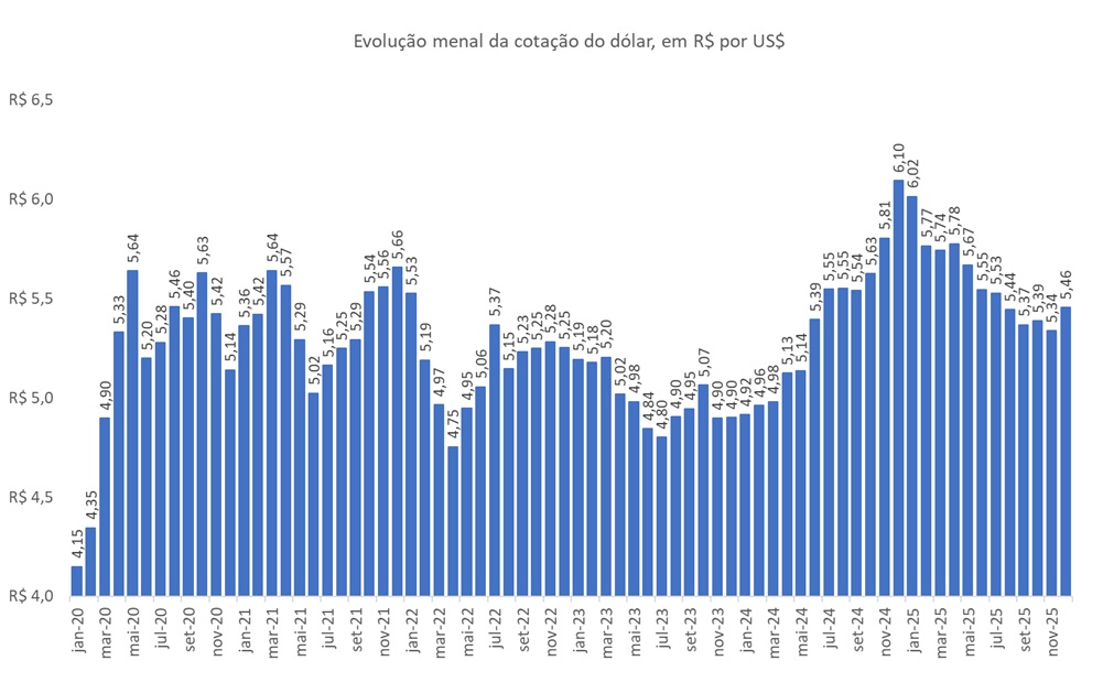 É importante observar que o dólar médio em dezembro de 2025 de R$5,46 ficou muito abaixo do valor praticado em dezembro de 2024, quando a média nominal foi recorde, alcançando o patamar de R$6,10.