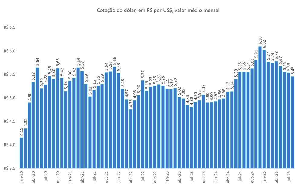 É importante observar que o dólar médio na parcial de agosto de 2025 foi de R$5,45, o valor mais baixo desde junho de 2024, como mostram os dados da Figura abaixo e também pouco abaixo do valor praticado no mesmo período de 2024 (R$5,55).