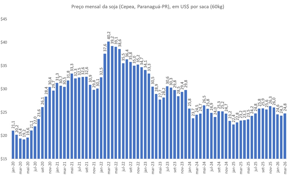 A Figura apresenta os dados médios do preço nominal da soja (Cepea, Paranaguá-PR), em dólares por saca, entre janeiro de 2020 e a parcial de março de 2026 (até o dia 16).