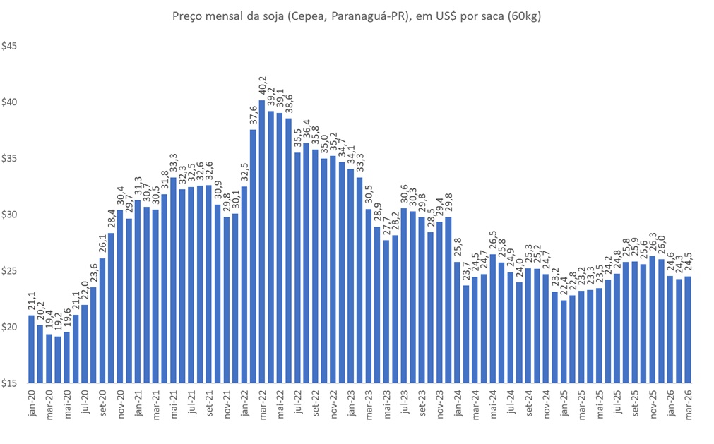 A Figura apresenta os dados médios do preço nominal da soja (Cepea, Paranaguá-PR), em dólares por saca, entre janeiro de 2020 e a parcial de março de 2026 (até o dia 4).