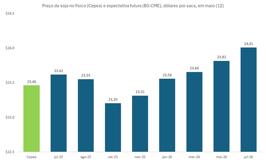 A Figura apresenta os dados do preço da soja no físico (Cepea, Paranaguá-PR) e futuro (B3-CME) para os vencimentos de maior liquidez entre 2025 e 2026, em dólares por saca, em maio (12).