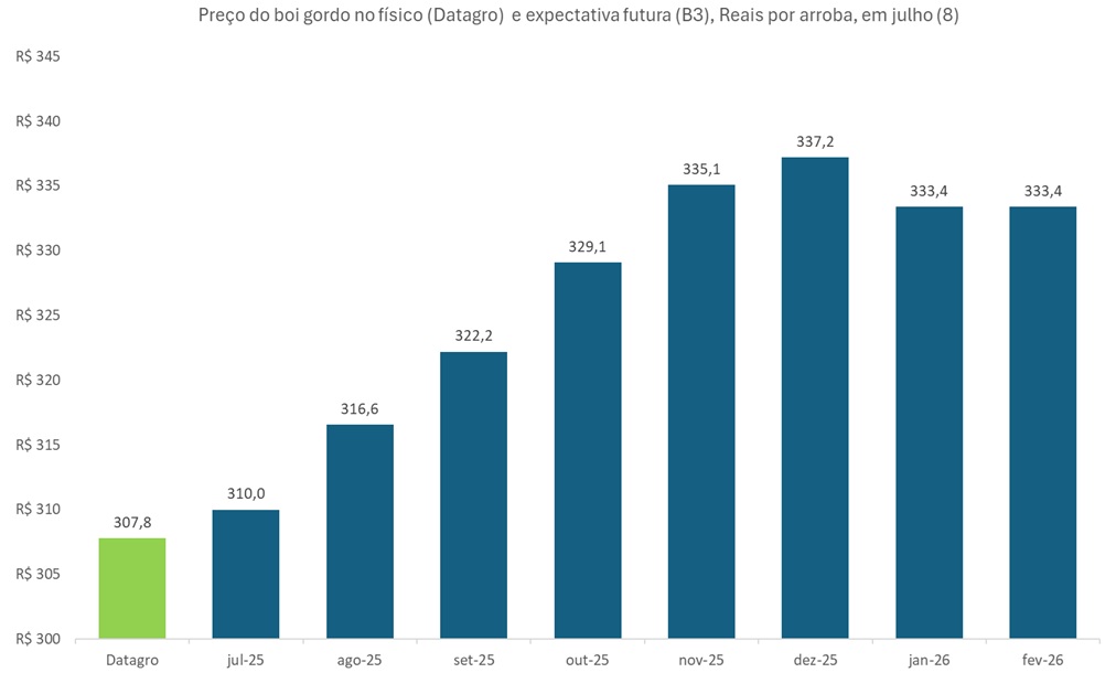 O preço futuro do boi gordo para os vencimentos entre julho e novembro de 2025 caíram, com destaque para o vencimento em outubro que, segue abaixo de R$330,0 por arroba pelo terceiro pregão consecutivo.