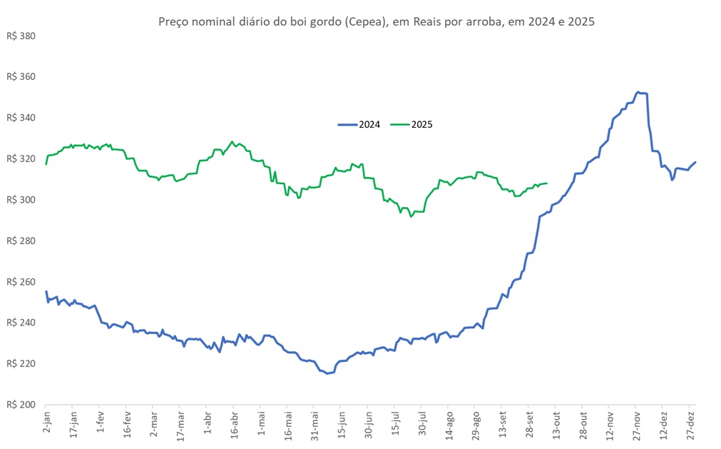 Aliás, é importante lembrar que o preço do boi gordo alcançou valor máximo em 2025 muito abaixo do valor máxima observado em 2024, pelo menos até a parcial de outubro como mostram os dados da Figura abaixo. Clique aqui e saiba mais do assunto!